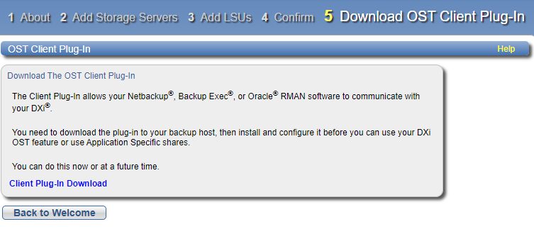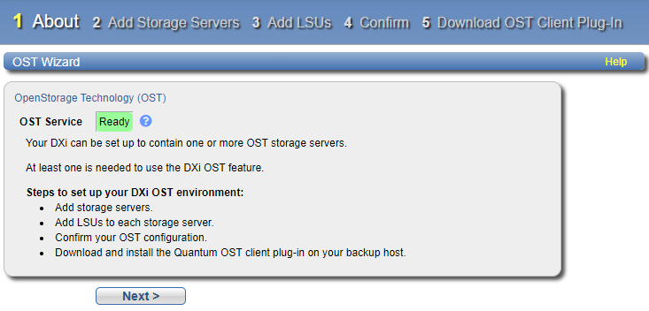 The OST wizard provides guided assistance for configuring the DXi to present its storage as one or more OST (OpenStorage) storage servers for use with a backup application. The wizard guides you through the process of adding one or more OST storage servers and configuring LSUs (logical storage units). The wizard also provides a link for downloading and installing the OST Plug-in on your backup host.