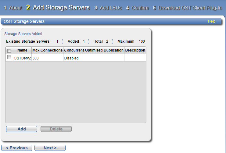 To remove a storage server, select it in the Storage Servers Added table and click Delete.