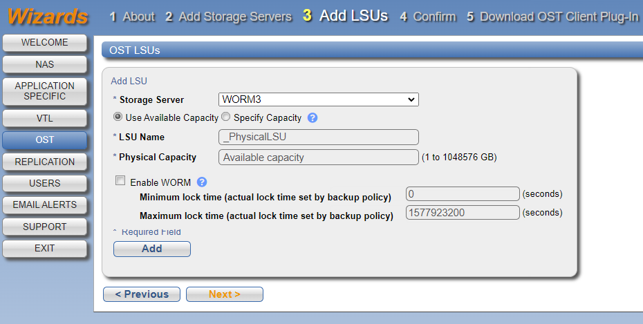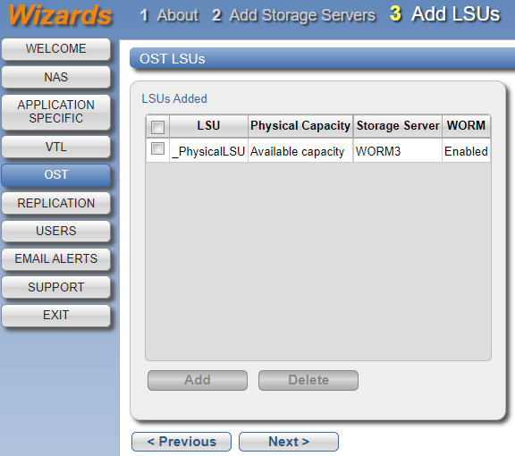 - You cannot use the OST wizard to edit existing storage servers or LSUs. For more information about working with OST, see OST Configuration.
