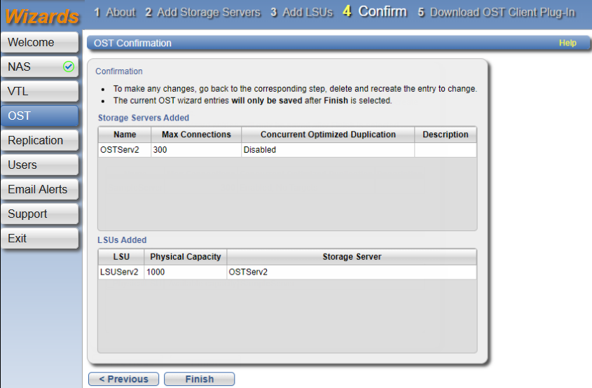 - To make changes to storage servers or LSUs you added, click Previous to return to the appropriate step. Select the incorrect item and click Delete to remove it, and then add a new item.