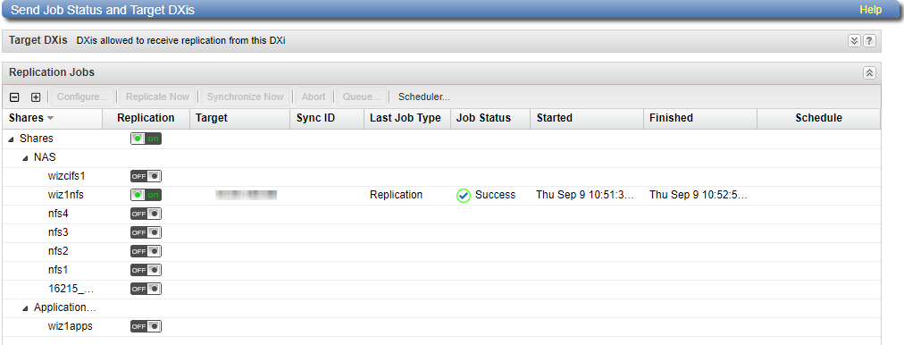 The Replication Send page allows you to manage outgoing replication activity for NAS or Application Specific shares. You can replicate shares on the V5000 to any other compatible DXi system. You can also schedule replication and view the status of current and recent replication jobs.