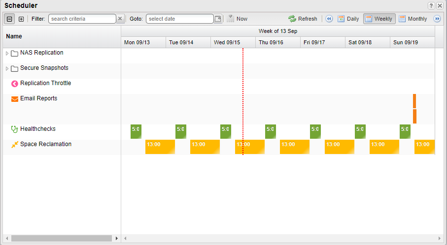 Note: Your view of scheduled replication for shares and other events like Secure Snapshots, throttling, etc., may be limited as it is controlled by your role and the access granted for your group in the Users screen. See the Manage Users' Server and Share Access section in the Configuration > System > Security topic. Any scheduling of Secure Snapshots will not be displayed on the Scheduler until Secure Snapshot has been enabled on the DXi server.