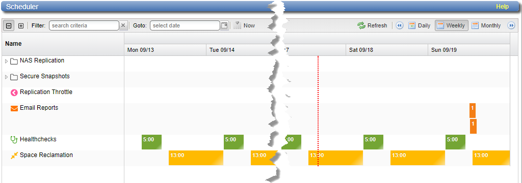 The Scheduler page displays all replication, e-mail reports, healthchecks, Secure Snapshots (if enabled at the server level), and space reclamation events scheduled to occur in a selected time period. To view scheduled replication events for NAS shares, click the arrow next to the folder to display all shares.