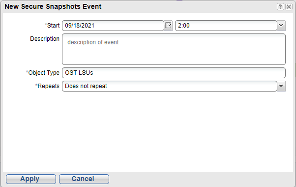 - To add a new event, click and drag on the schedule in the row for the type of event to add. When you complete the New Secure Snapshots Event dialog, a new event will be added where you dragged the cursor and if needed, further adjusted the date and time for the event in the dialog.