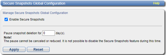 Use the instructions in this topic to enable Secure Snapshots in the Secure Snapshots Global Configuration screen. Another control on this screen can be used to pause the deletion of snapshots that have been scheduled or have been created.