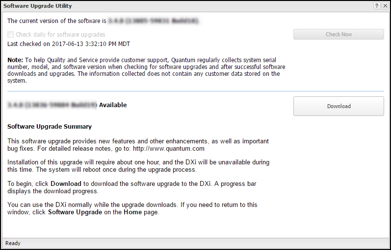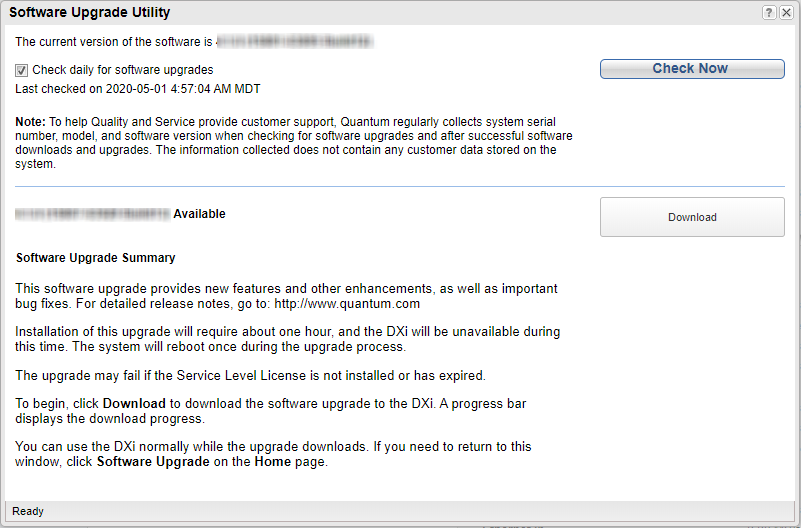 The Software Upgrade Utility (accessible from the Home page) allows you to check for available system software upgrades and, if available, download and install them. You can also configure the DXi to automatically check for software upgrades.