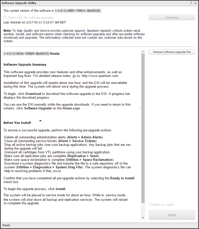 Note: The Ready to install check box and the Install button are disabled if there are any outstanding administration alerts or service tickets.